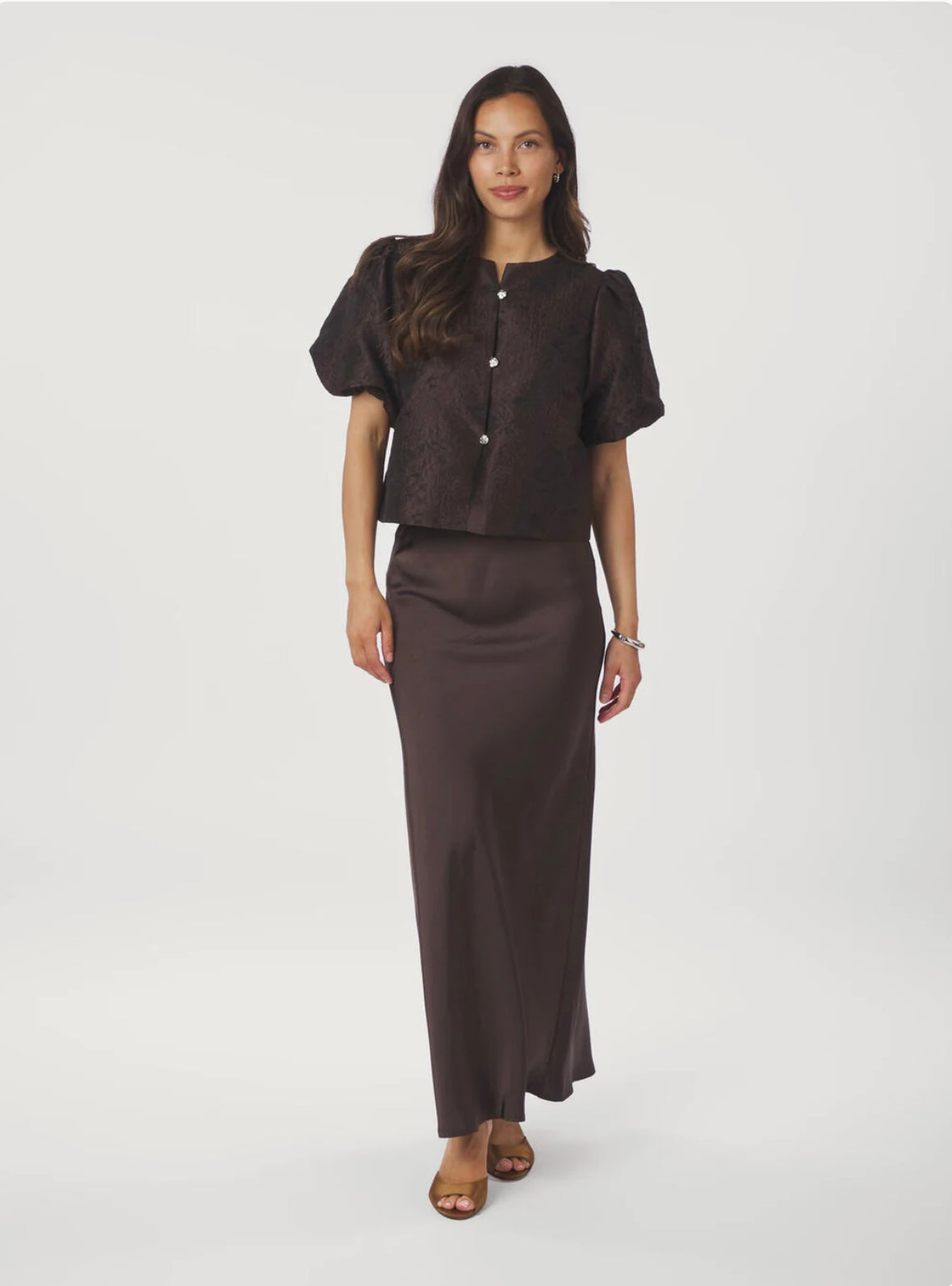 Aisa is a structured, elegant top with soft statement sleeves. styled here with our chocolate brown skirt this is the perfect outfit for Christmas!