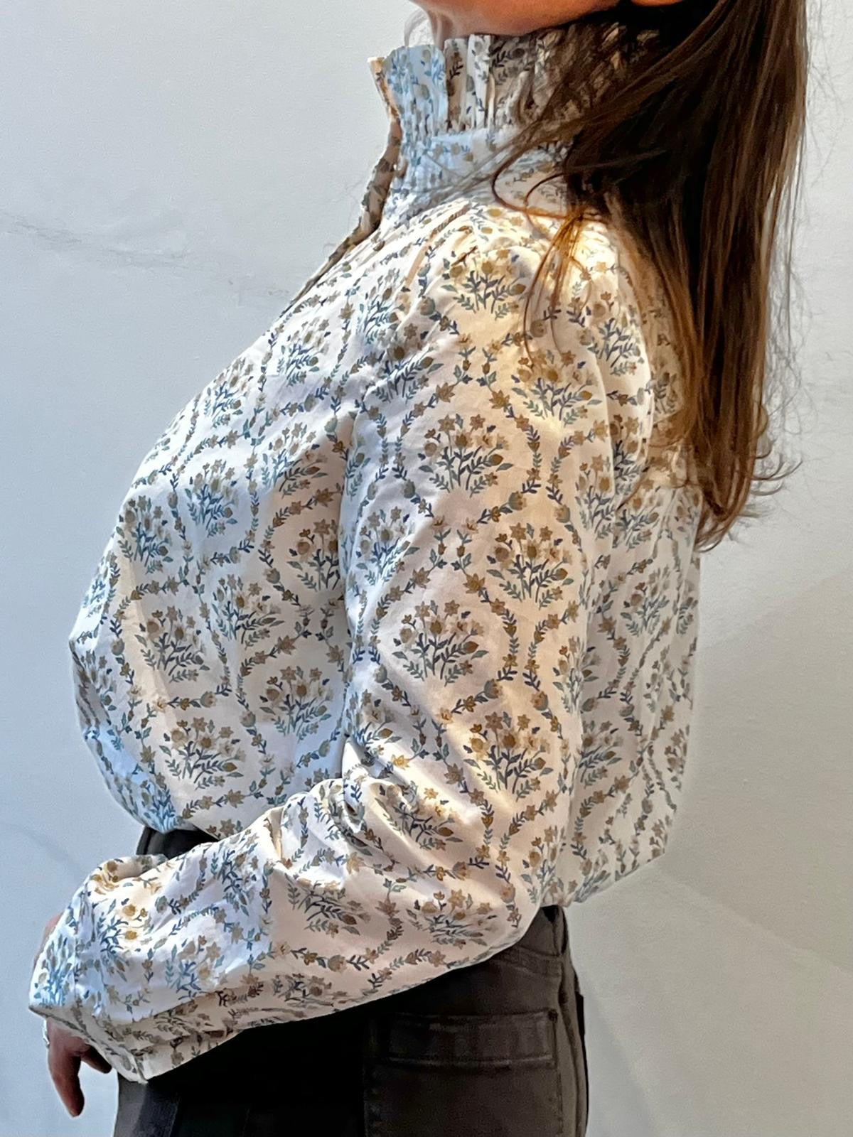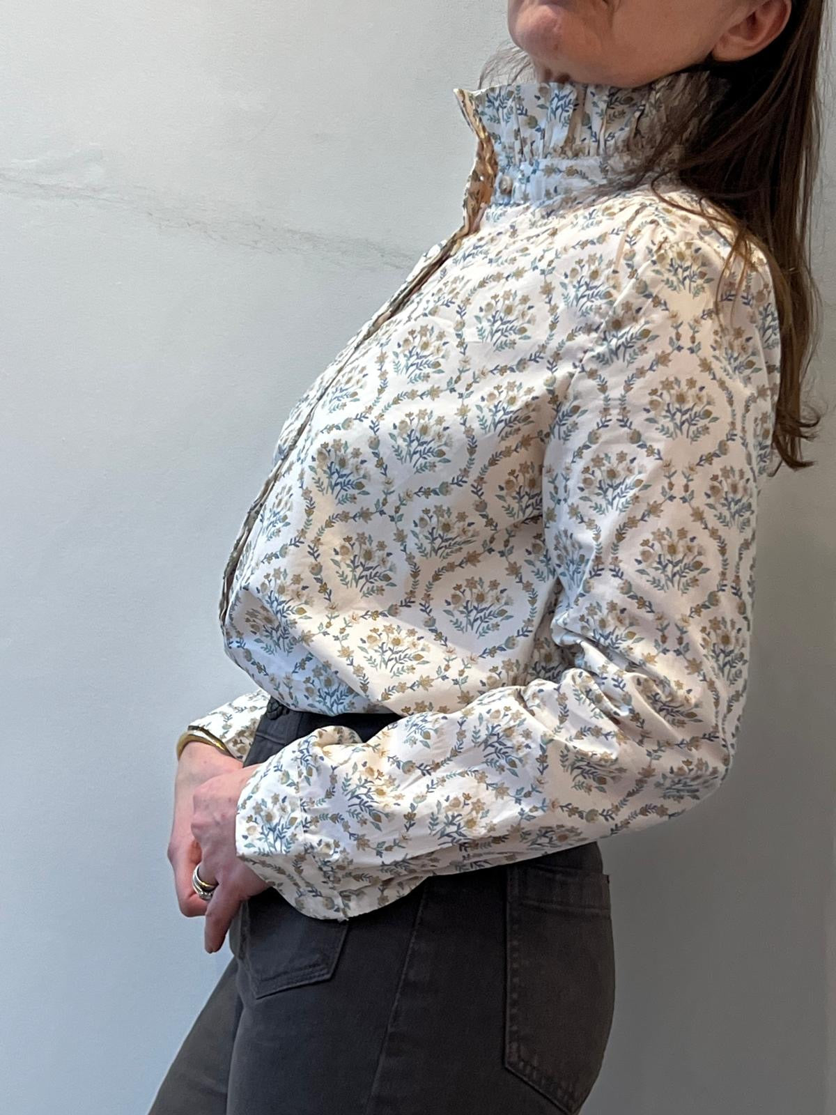 Chloe is a long-sleeve blouse in a soft off-white/cream base with an all over delicate floral print in muted green and beige tones. The blouse has a vintage, romantic feel, a classic feminine.