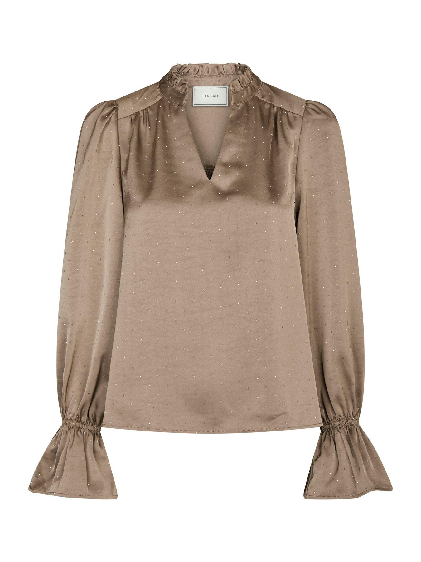Amara is an elegant blouse made of a satin-like fabric in a taupe color. It features subtle dotted embellishments or a delicate textured pattern throughout, adding a bit of shimmer and sophistication.The long sleeves are slightly puffed at the shoulders and gathered at the wrists with elastic or smocked cuffs, creating a soft, ballooned effect.