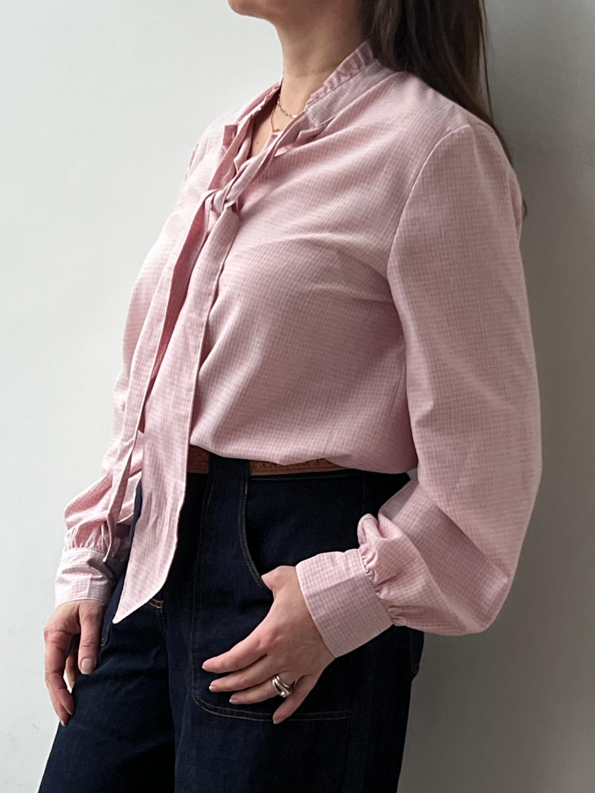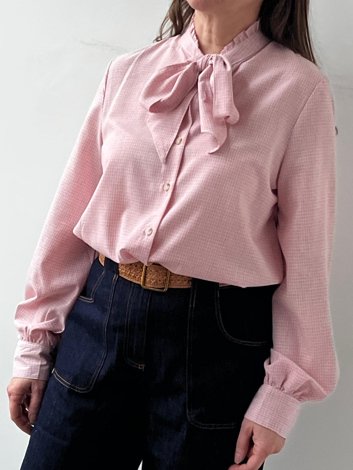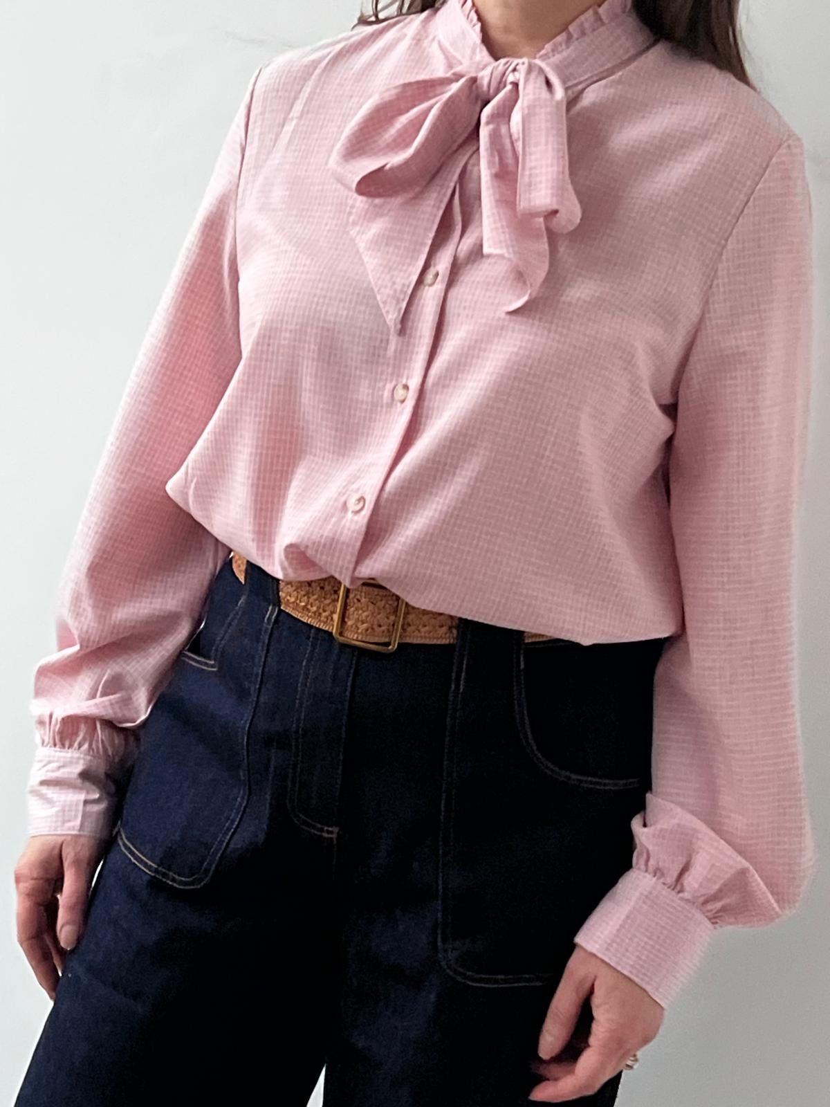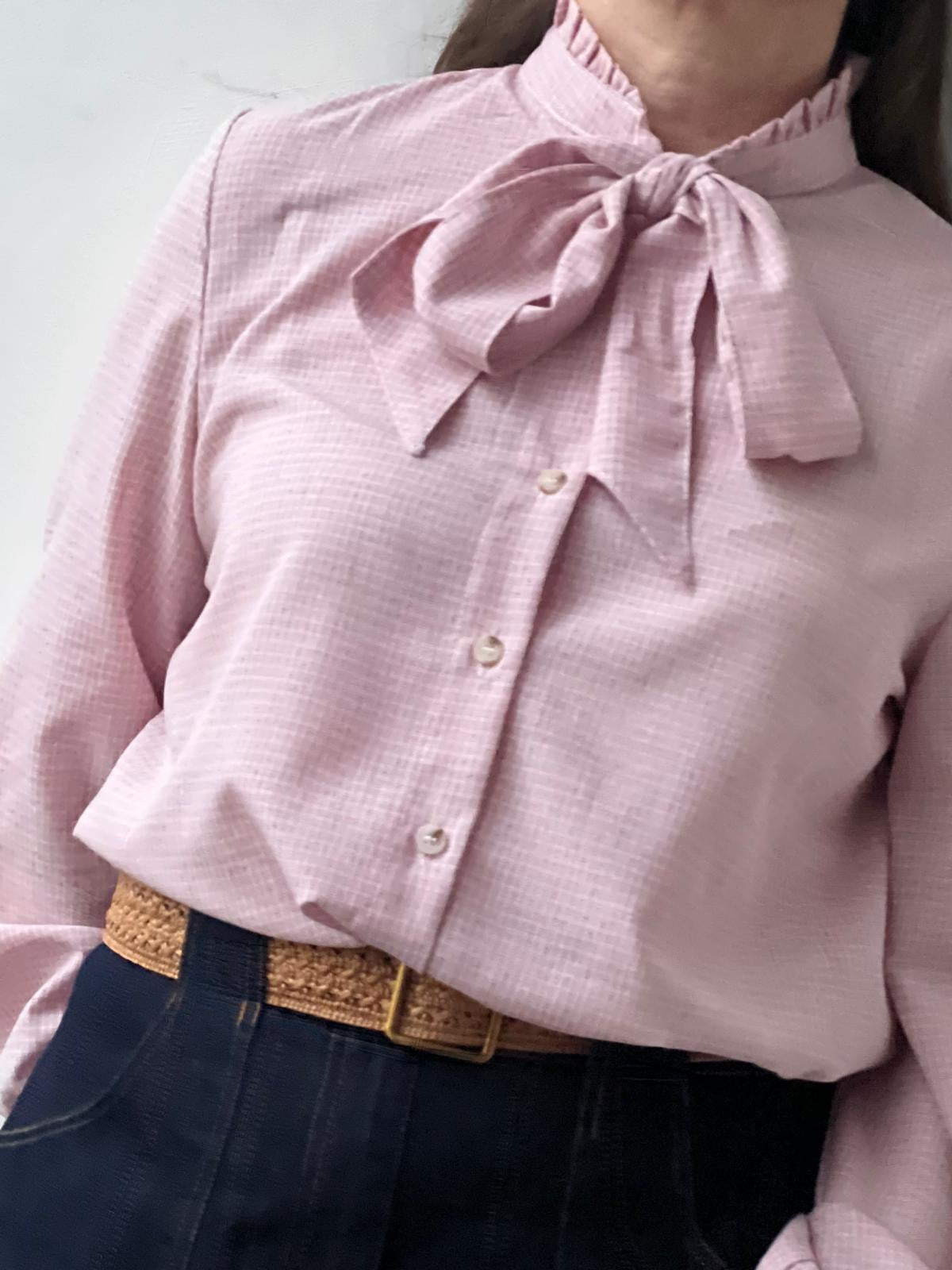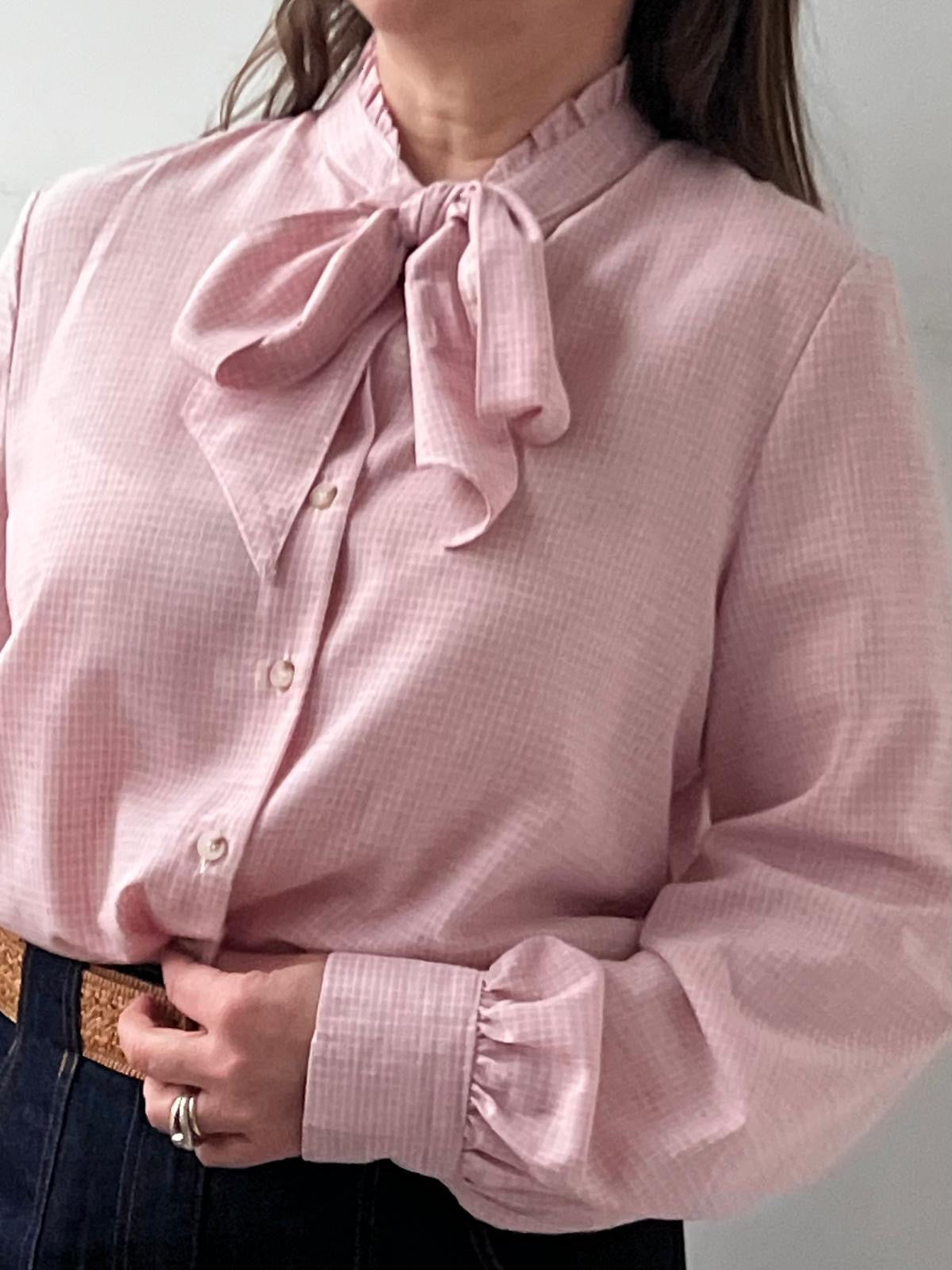 Mariele is a classic long-sleeve blouse in pink with a high neckline and an attached bow tie that drapes at the front.