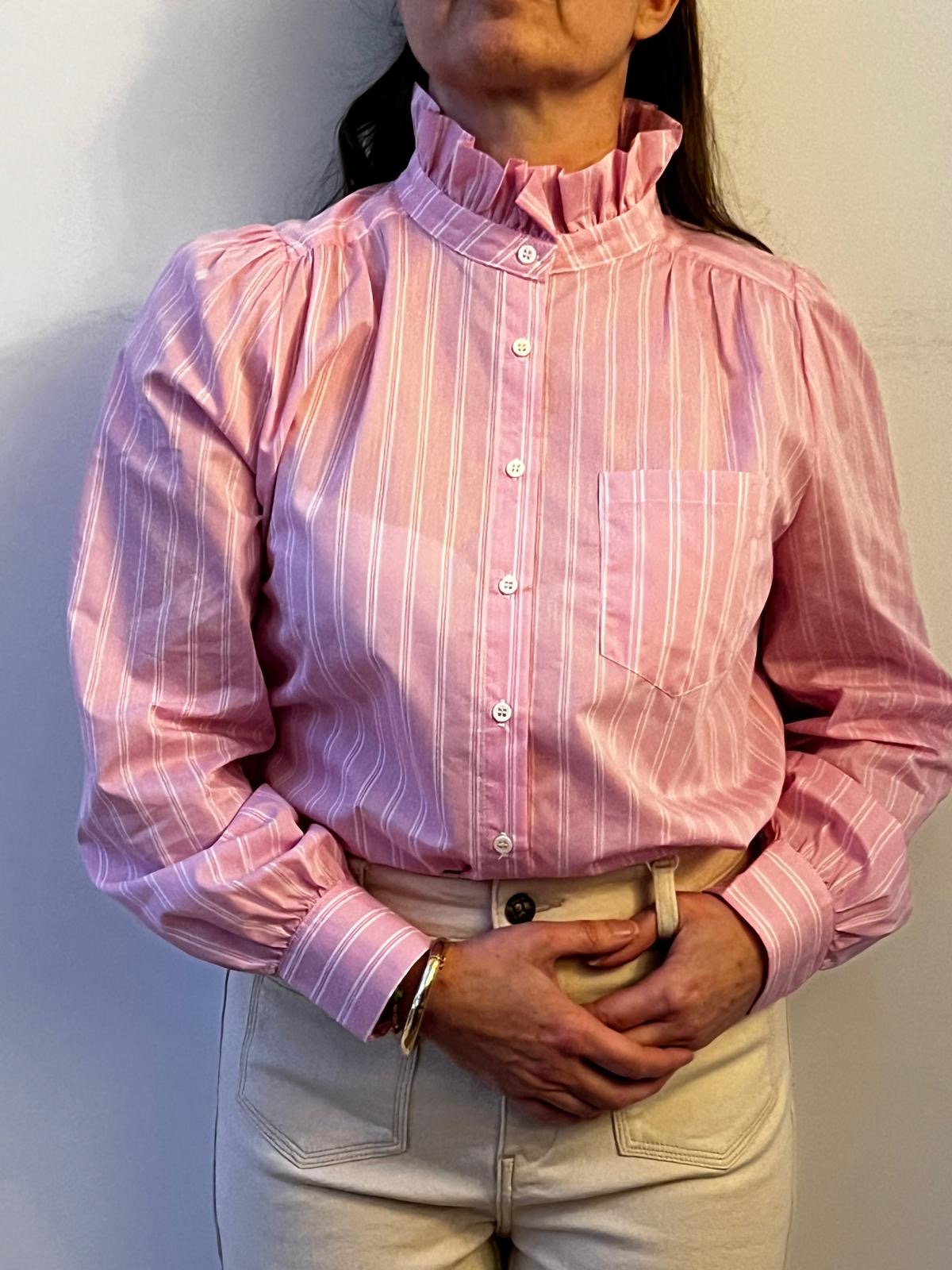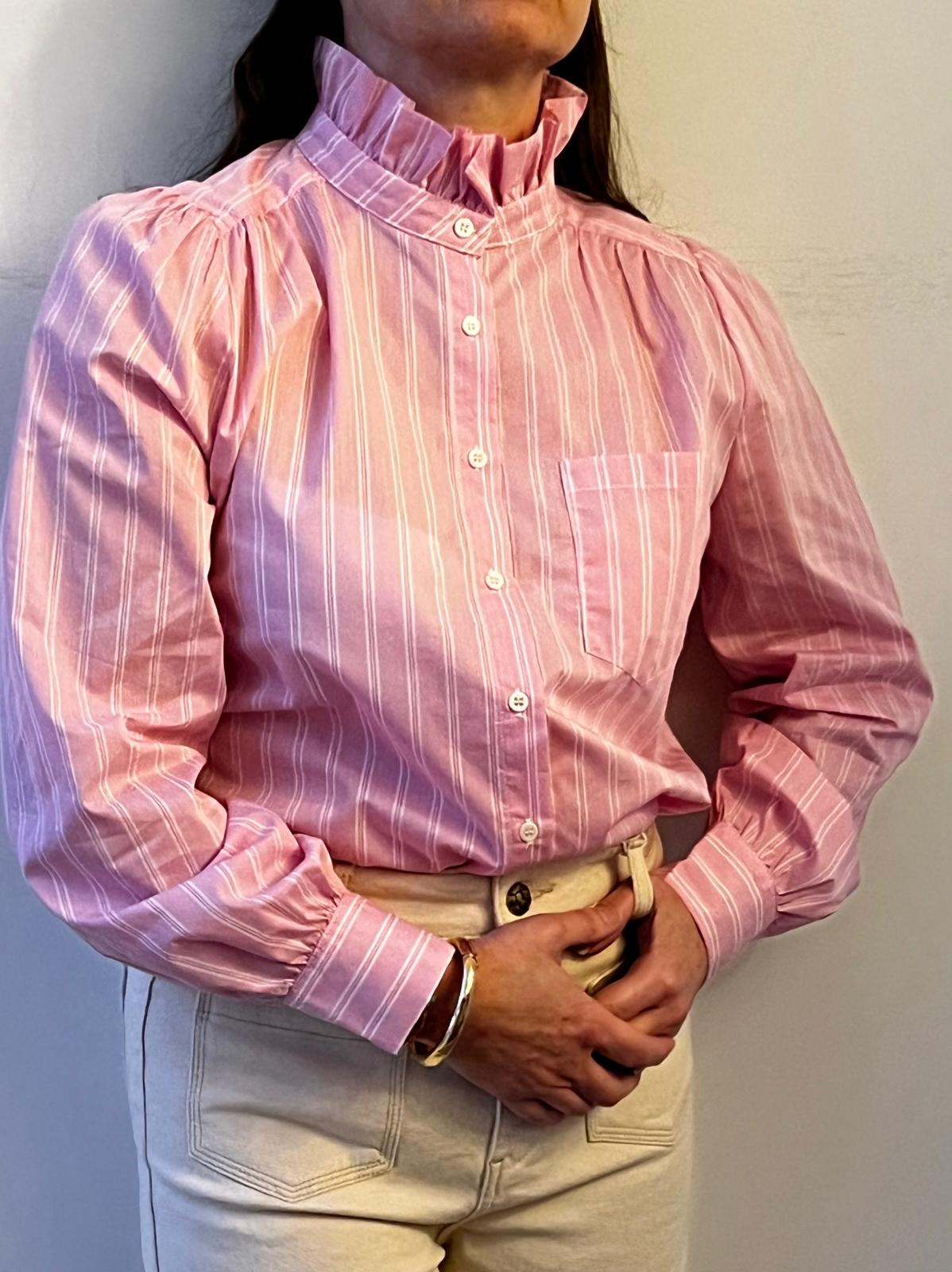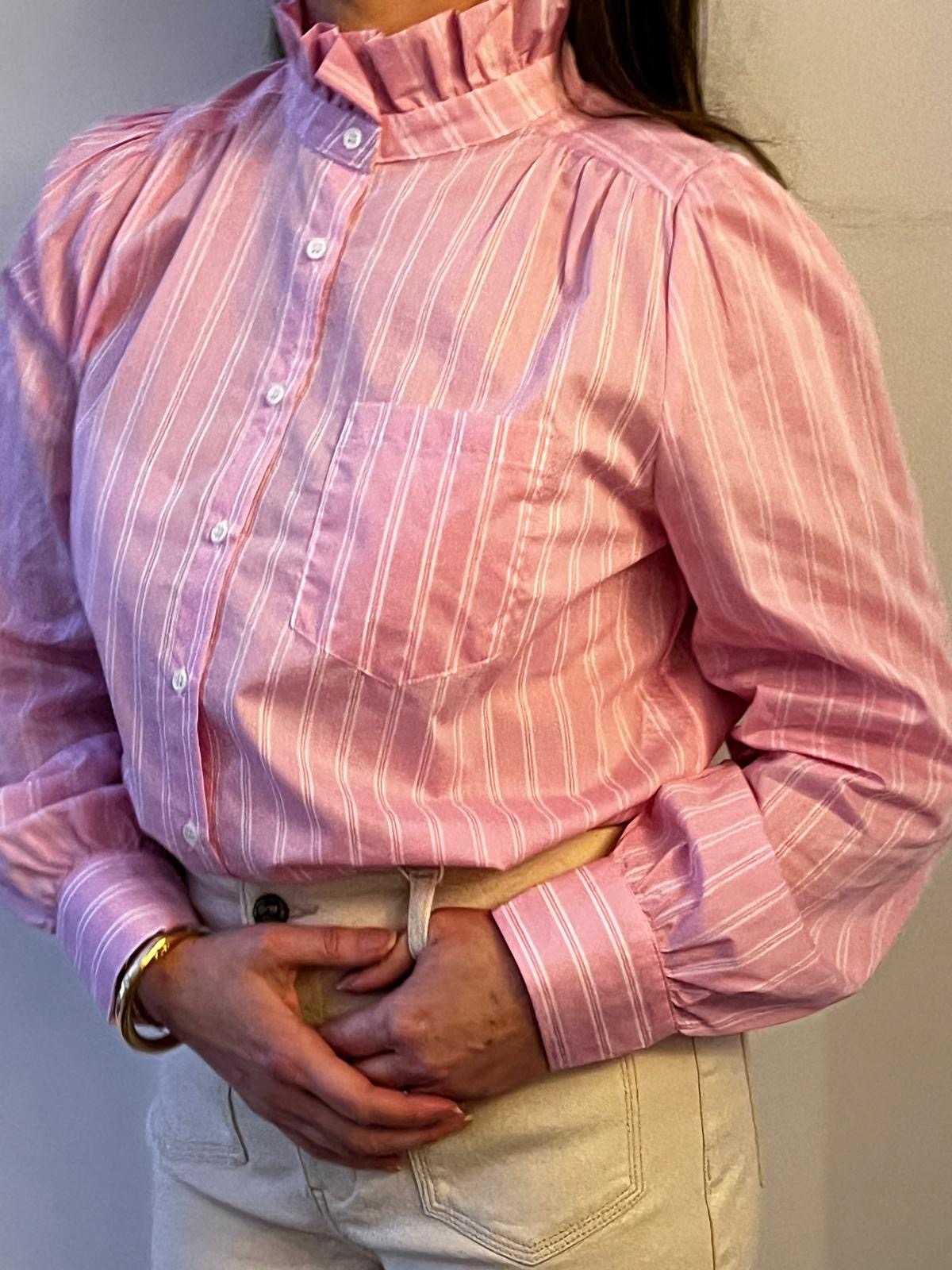 ISIA is a pink, vertically striped button-up blouse with a high ruffled collar and gathered shoulders. The blouse has long sleeves with wide cuffs and a small chest pocket, tucked into high-waisted, light beige pants. The overall look feels classic and slightly vintage, with soft, tailored details.