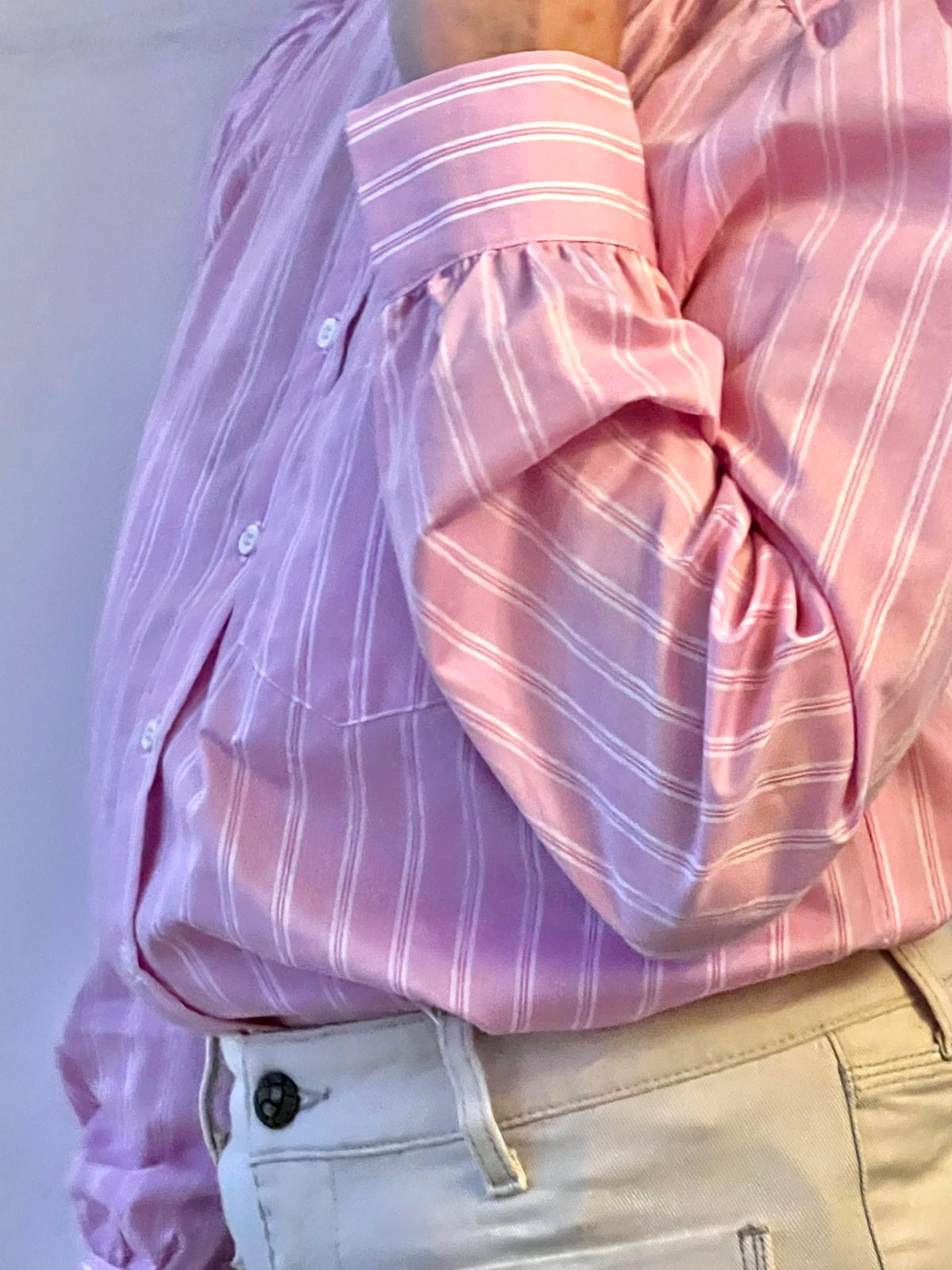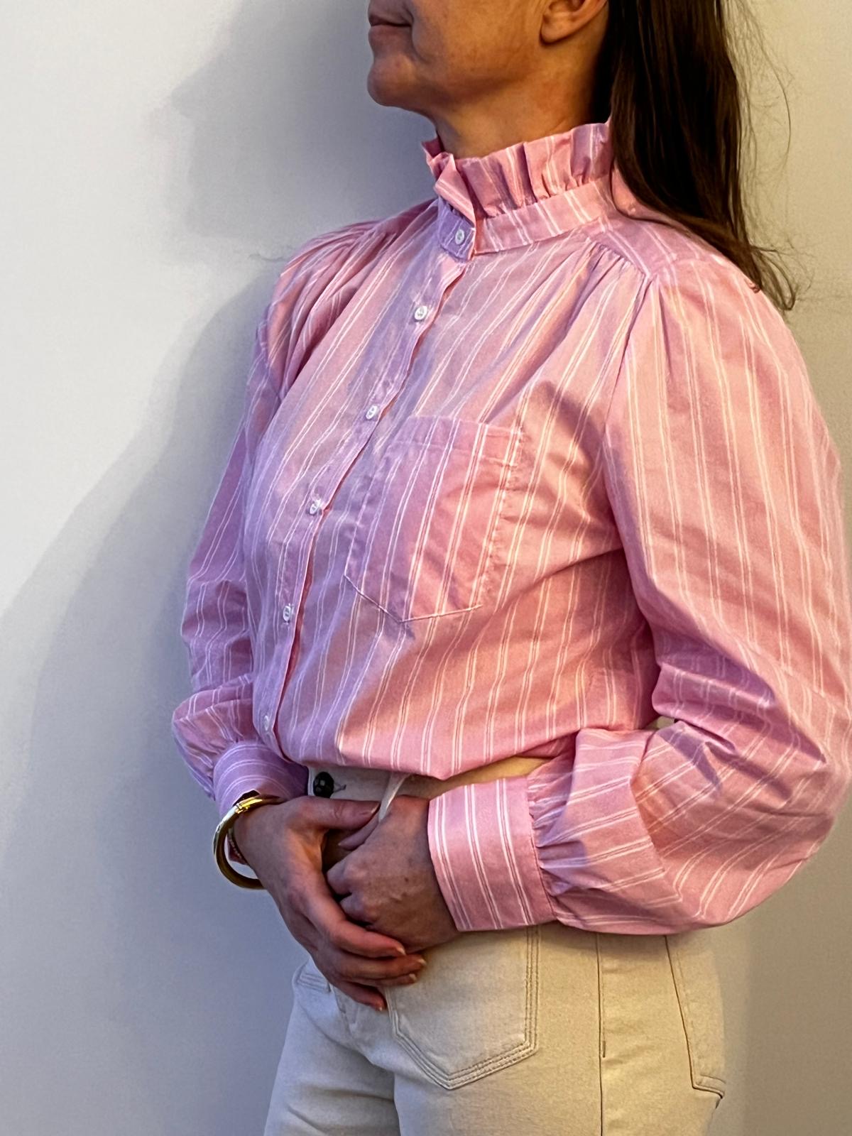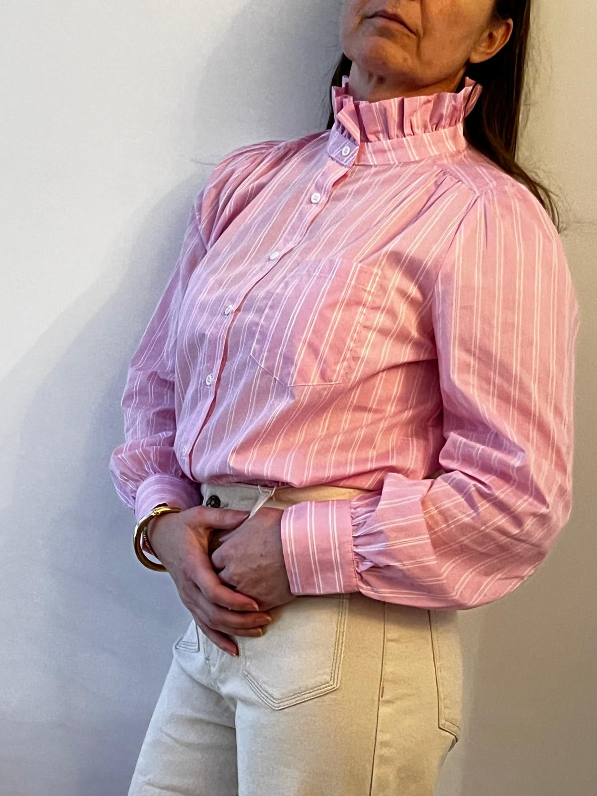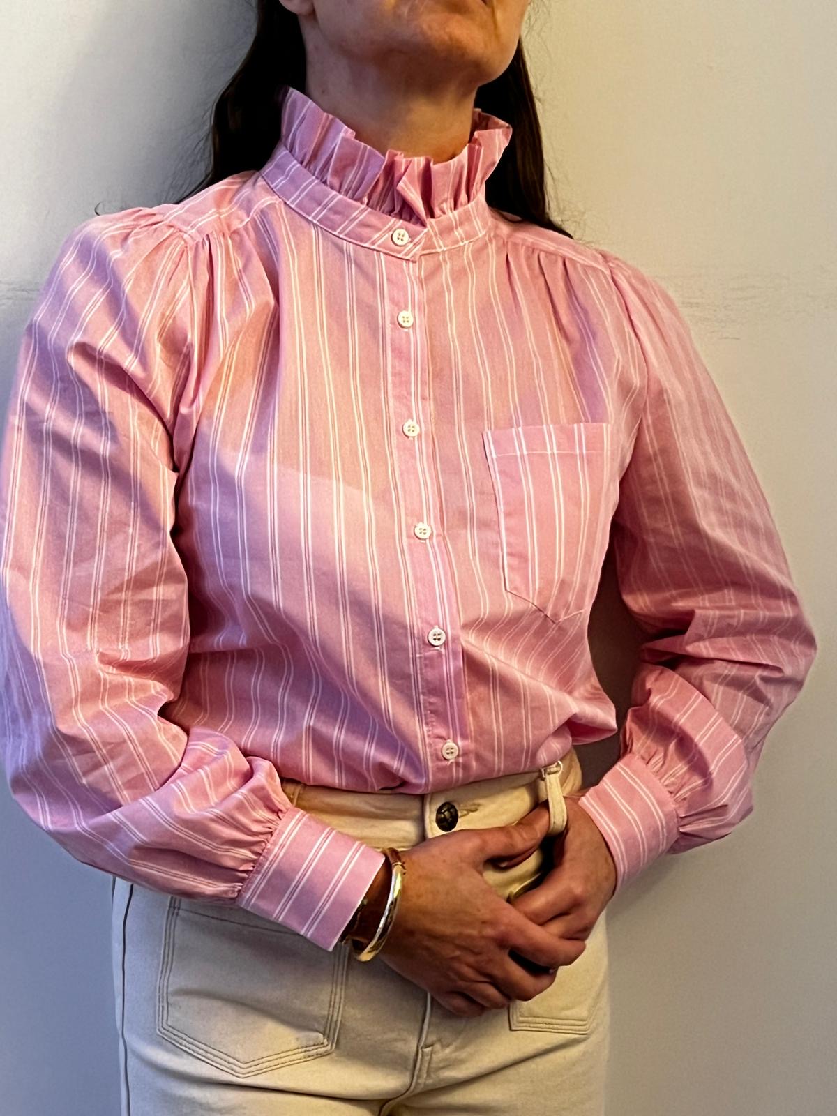 ISIA is a pink, vertically striped button-up blouse with a high ruffled collar and gathered shoulders. The blouse has long sleeves with wide cuffs and a small chest pocket, tucked into high-waisted, light beige pants. The overall look feels classic and slightly vintage, with soft, tailored details.